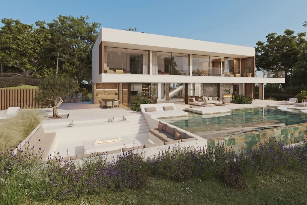 Set on a generous plot of approx. 2,750 m², this stylish villa offers around 536 m² of living space across three levels. Its architecture blends modern design with Mediterranean accents, while the minimalist, high-quality interior creates an elegant and inviting atmosphere.