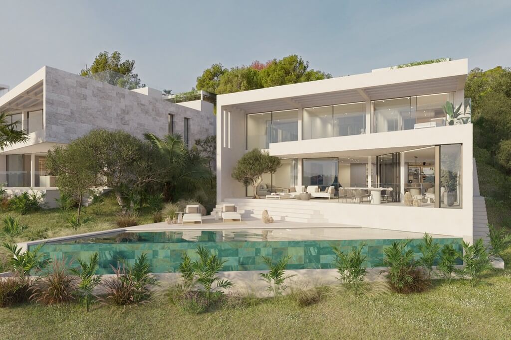 Perched high above the sought-after coastal enclave of Camp de Mar, this newly constructed designer villa sets a new benchmark in architectural sophistication and panoramic living. Situated on an elevated 1,117 m² hillside plot, the property offers mesmerizing views over the valley, surrounding mountains, and a lateral glimpse of the shimmering Mediterranean Sea.