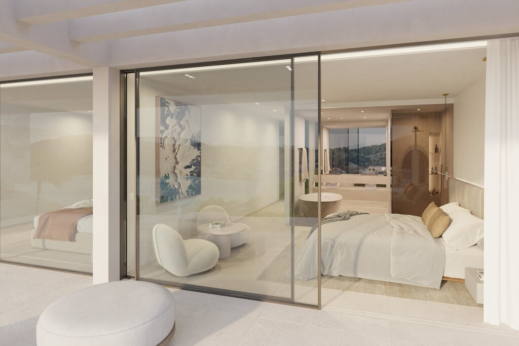 Spanning approx. 558 m² of living space across three levels, this residence effortlessly combines modern luxury with Mediterranean flair. The expansive open-plan living and dining area features a sleek fireplace and full-height sliding glass doors that extend the interior seamlessly onto the sun-drenched pool terrace. When opened, these glass walls dissolve the boundary between indoors and outdoors, framing a spectacular landscape.