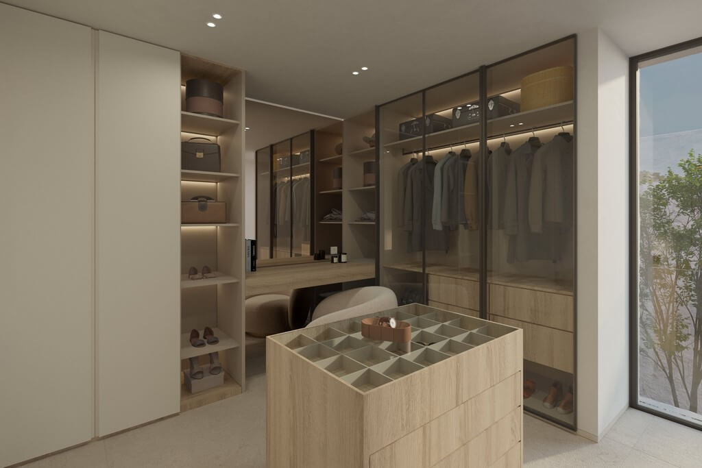 At the heart of the home is a state-of-the-art designer kitchen, complete with a central cooking island, integrated wine fridge, and top-tier appliances. A neutral palette of sand and beige tones, paired with natural textures and clean lines, creates a calm and timeless aesthetic throughout the villa.